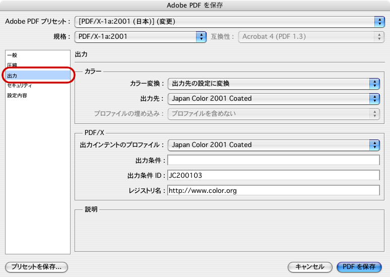 - PDF/X:出力インテントプロファイル...任意のプロファイルを選択してください...例えば「Japan Color 2001 Coated」など