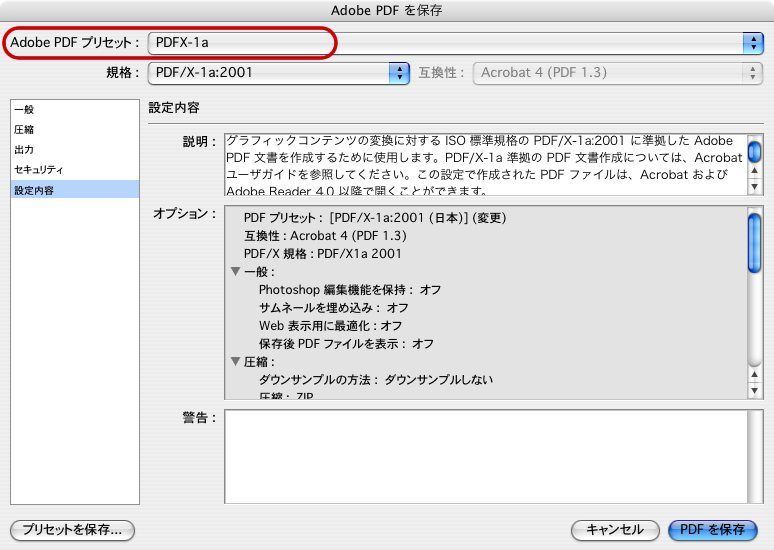 「Adobe PDF プリセット」は「[PDF/X-1a:2001(日本)]」を選択します。設定を変更すると[PDF/X-1a:2001(日本)](変更)となりますが問題はありません。