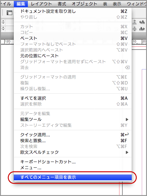 メニューから「編集」→「すべてのメニュー項目を表示」を選択します。
