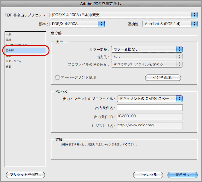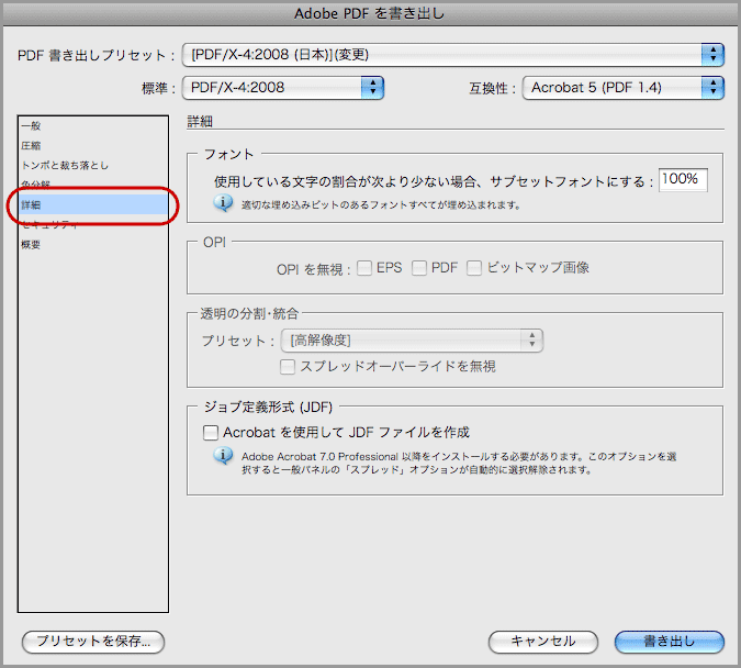「Adobe PDFを書き出し」のダイアログが出てきたら、上部にある「PDF書き出しプリセット」を「PDF/X-4:2008(日本)」に設定します。