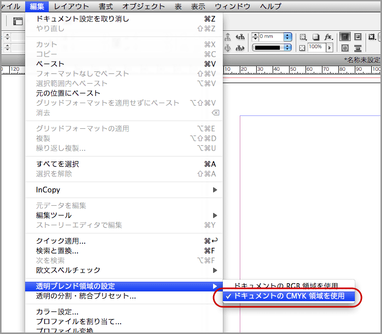 メニューから「編集」→「透明ブレンド領域の設定」→「ドキュメントのCMYK領域を使用」にチェックが付いているかどうかをご確認下さい。
