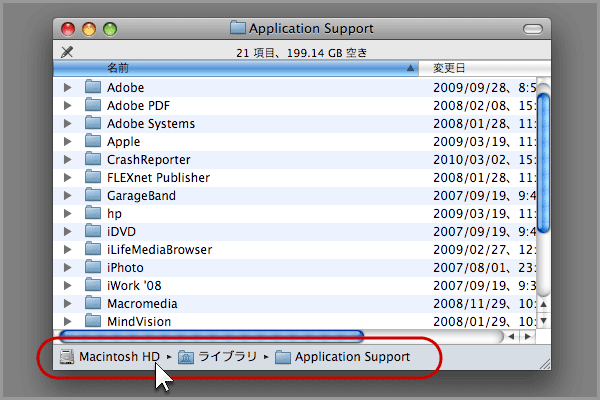 以下のフォルダ「Application Support」をFinderで開いているとします。