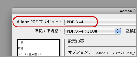 「Adobe PDFプリセット」→「自分が決めたプリセット名」(PDF_X-4など)を選択すると、PDF変換の設定が自動的にされます。