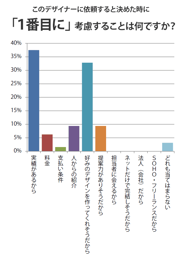 今回のアンケート結果で「1番目に」考慮することを見てみると、「実績があるから」(以下「実績」)を選択された方が、全体の38%となり、デザイナーを決定する際に、デザイナーが今までどのような活動・仕事をしてきたのかを重要視する傾向がわかった。