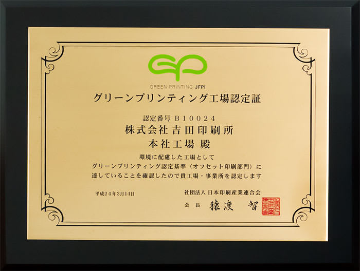 吉田印刷所は2015年3月13日に地球環境に配慮した印刷物を製造できる工場認定の「グリーンプリンティング(GP)」の更新認定されました。