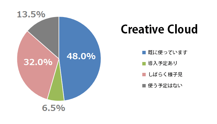 今回の調査結果では、Creative Cloud(以下CC)の利用割合は半数に近くなり、検討中のユーザーを含めると半数を超える結果となった。
