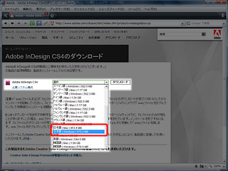 2.使ってみたい製品のところにマウスカーソルを持って行くと、文字が浮き出てきますので、その中から「体験版」にマウスカーソルを合わせ、クリックします。今回は、InDesign CS4をダウンロードしてみます。