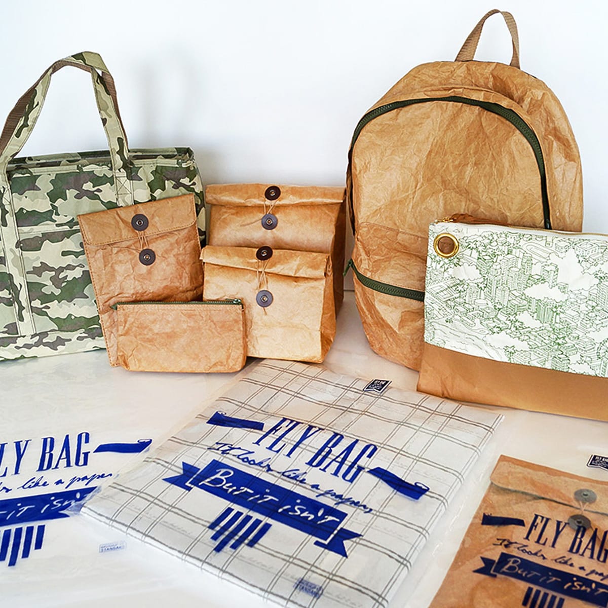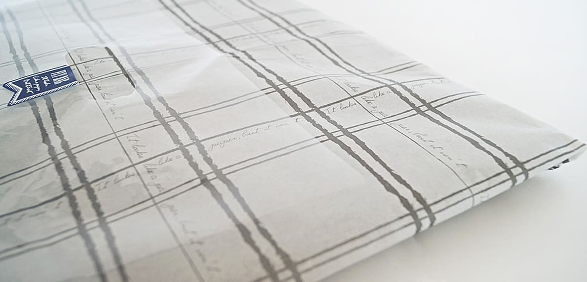 FLY BAG様の包装紙として、純白ロール(30g/㎡)をご利用いただきました。大判を店舗で必要サイズにカットして使用。目指したものは“雰囲気のいい、見せる包装”。透明バッグとの組み合わせもマッチしています。
