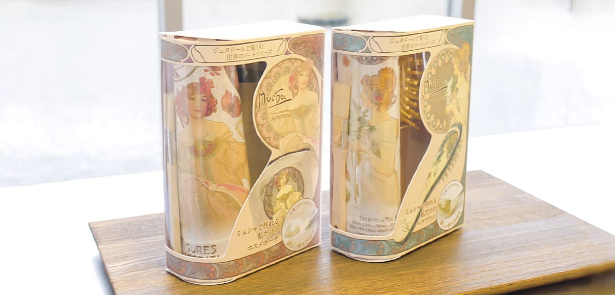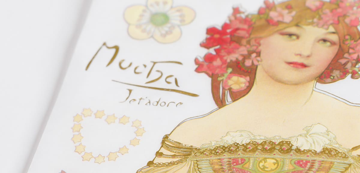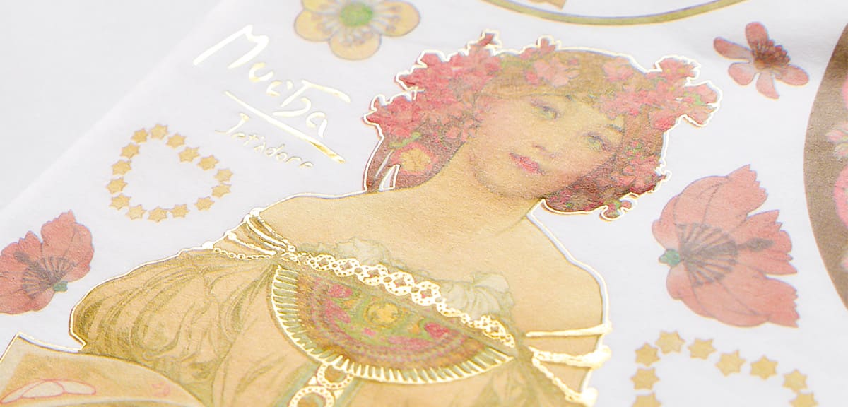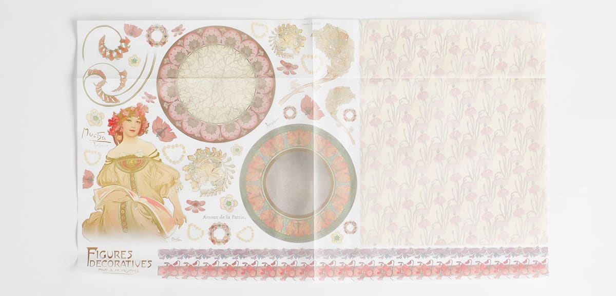 雑貨デコレーションとして人気のジュタドールのペーパー素材にご利用いただきました。繊細な絵柄の再現に加え、金の箔押し加工が豪華です。tカラペ・ホワイト(18.7g/㎡)はちぎって貼ってのデコ作業がしやすいそうです。