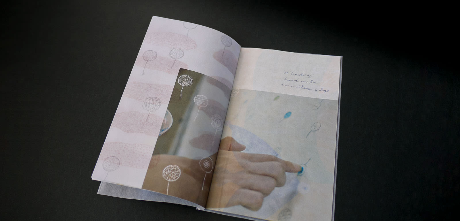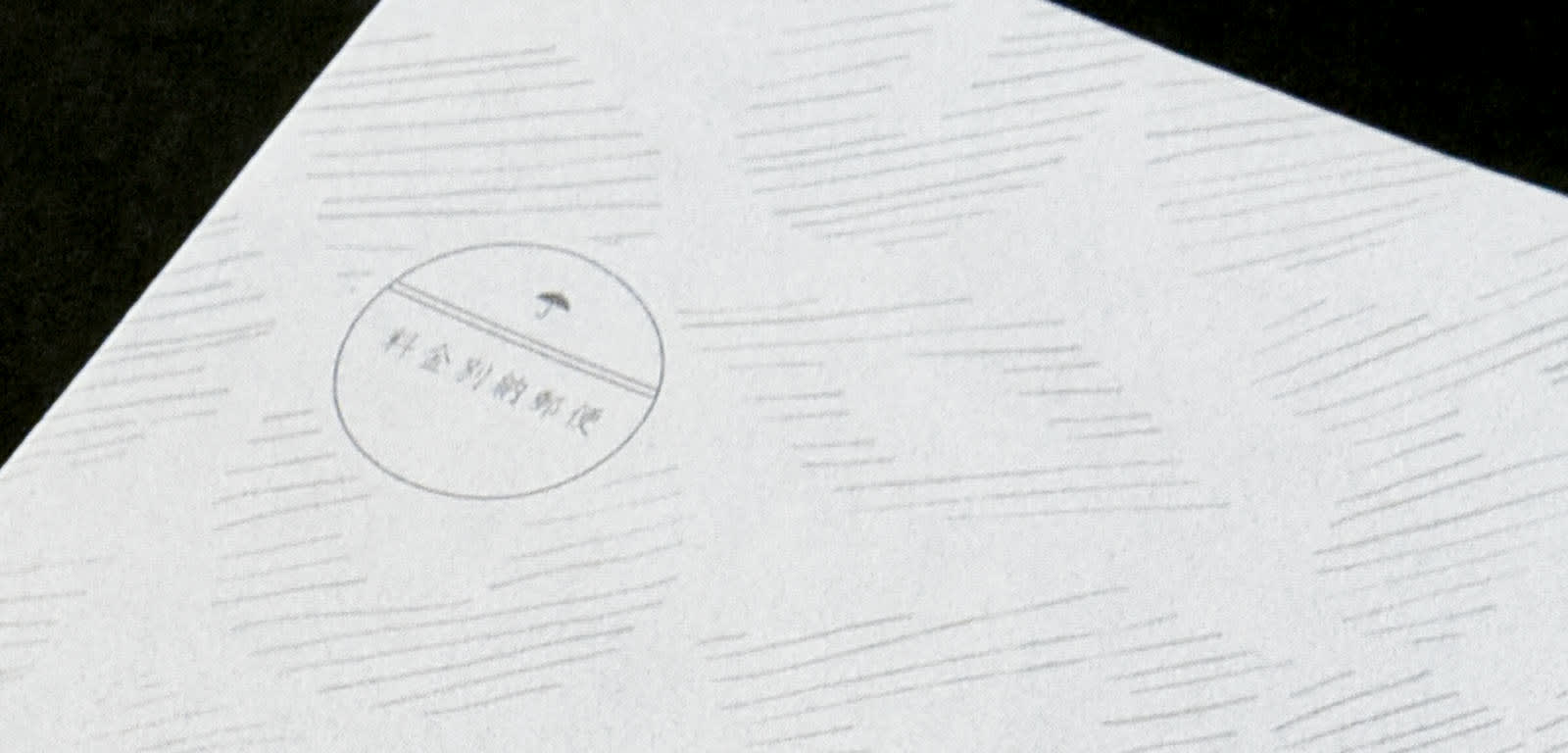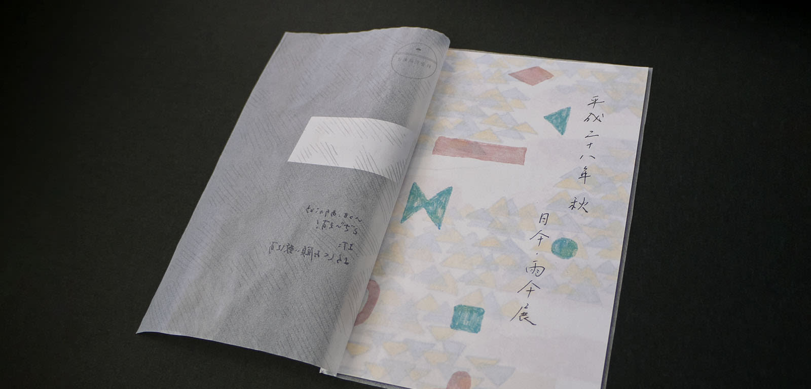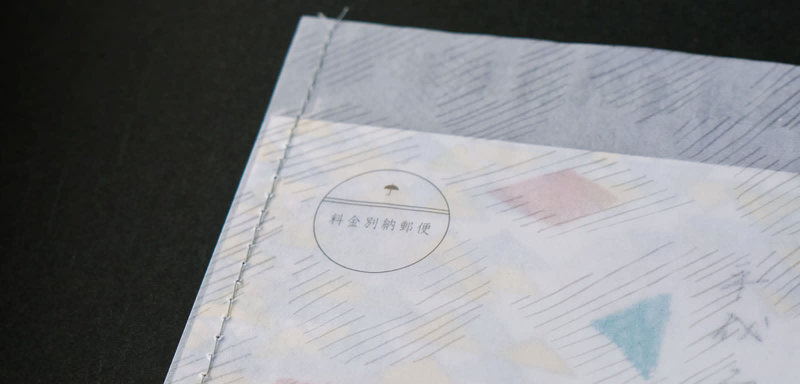 展示会イベント案内状の封筒にご利用いただきました。グラシン厚口(30.5g/㎡)に薄く線で図形が、鉛筆調のグレーで印刷されています。グラシン紙を二つ折りして、間に案内の冊子を挟んで、左側を糸で縫って綴じています。