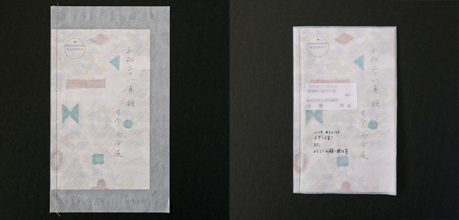 封筒は上下と右側は糊付けしており、郵送時に開いてしまうことはありません。封筒をハサミで切ると、グラシン紙が案内の冊子のカバーになったような仕上がりになります。