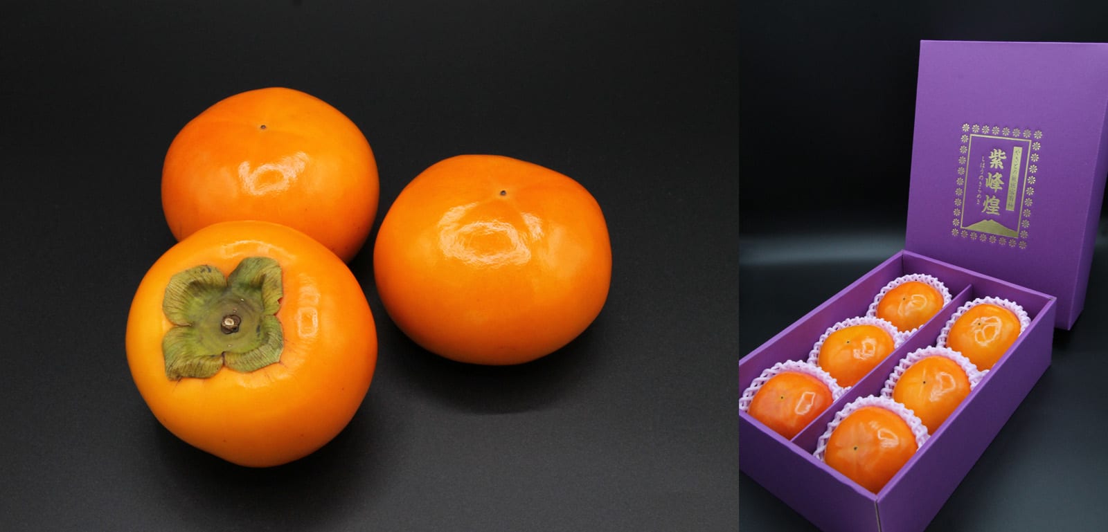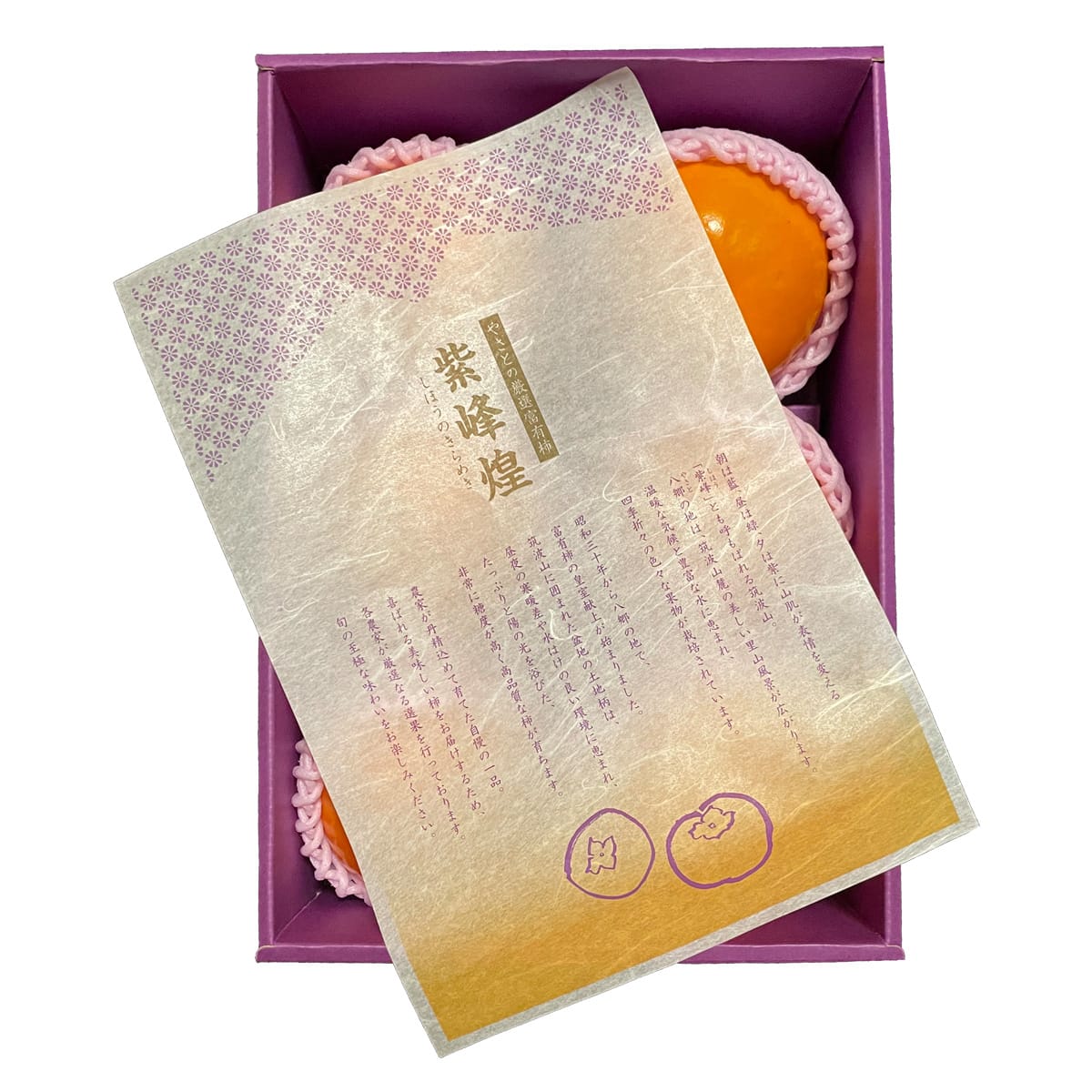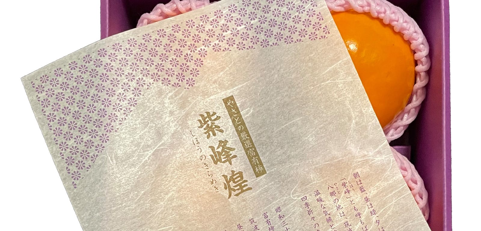 2021年度11月中旬から販売する「やさとの厳選富有柿 紫峰煌(しほうのきらめき)」の化粧箱内の掛け紙として活用。