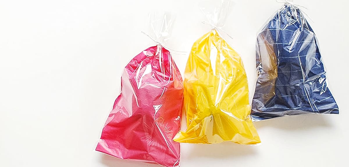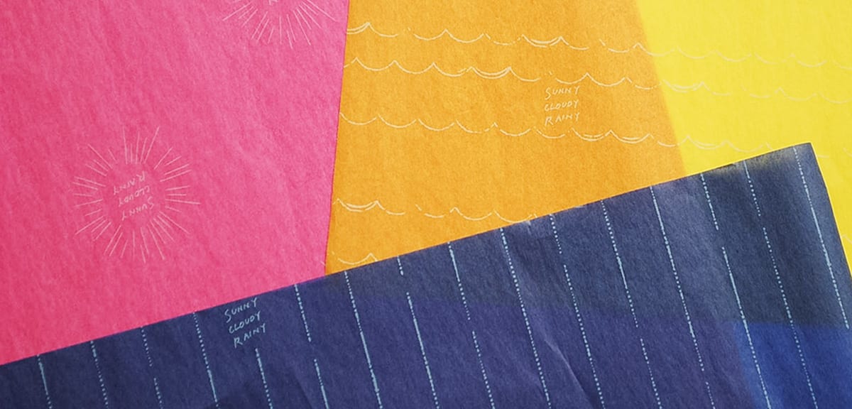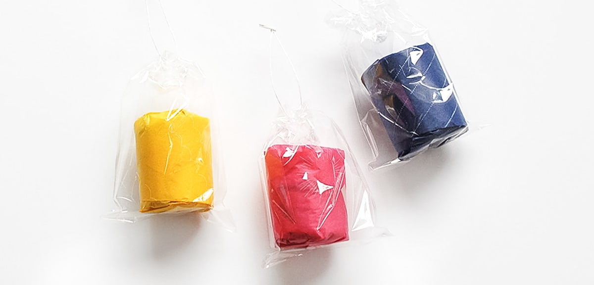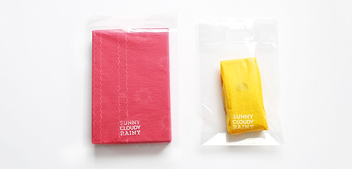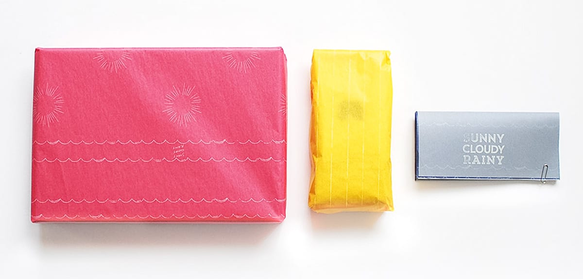 ローズ、レモン、マリン、3色のtカラペ(18.7g/㎡)にホワイトインキで印刷した包装紙です。ビニール袋と重ねたり、通信販売用にトレーシングペーパーと重ねて納品書を包んだり、使用方法にも工夫をこらしておられます。