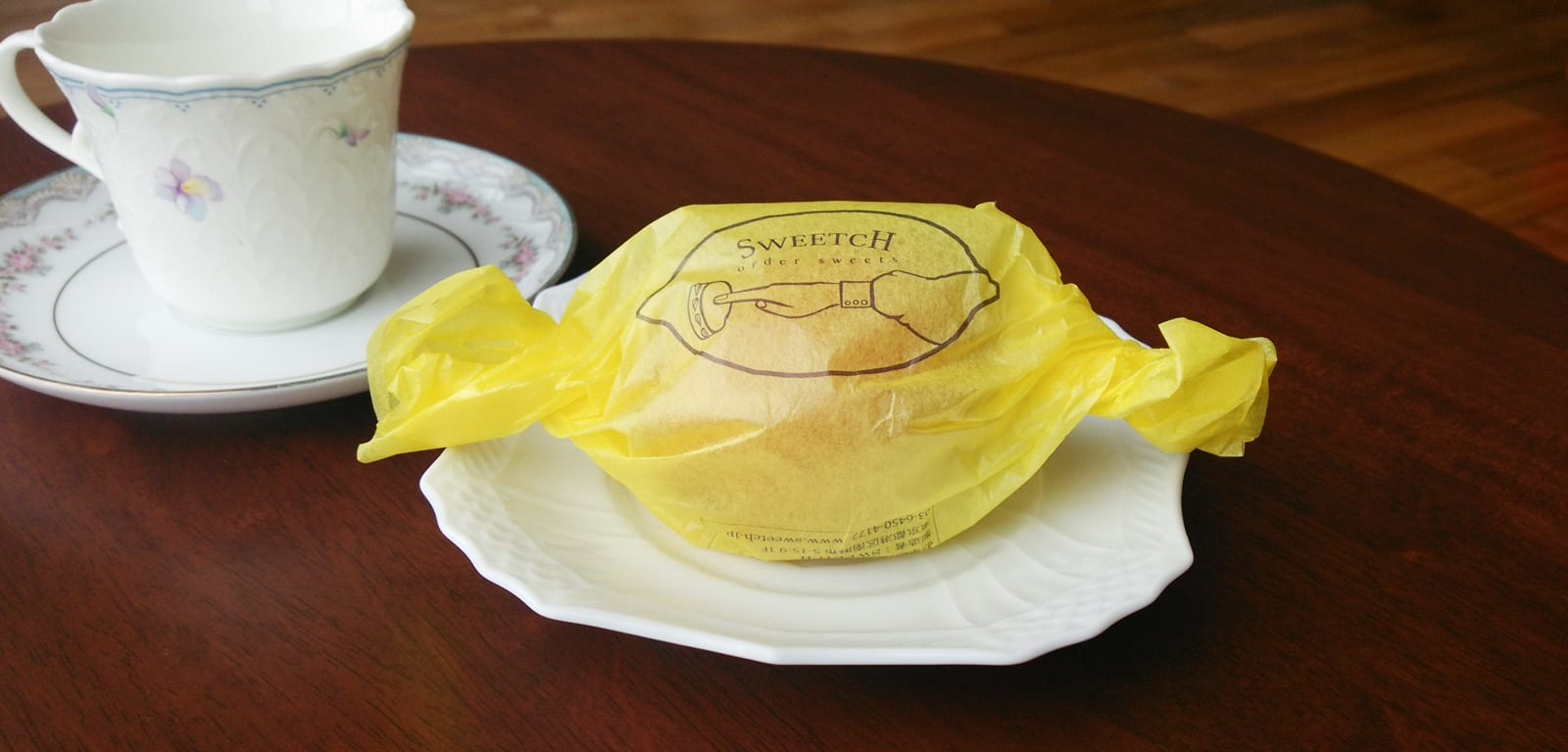 オーダースウィーツ店SWEETCH様のレモンケーキ包装紙をお作りしました。真っ白な薄葉紙菊(14g/㎡)に鮮やかなイエローとレモンの形にアレンジした店名ロゴを印刷。瀬戸内海産無農薬レモンにこだわったパティシエールの想いを伝える包装紙となりました。