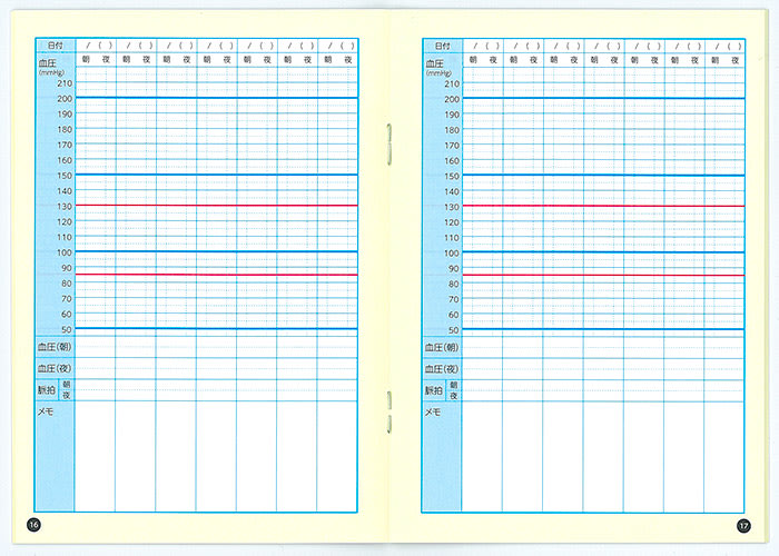 見開きで2週間分、1冊で7か月分の血圧がチェックできる手帳です。