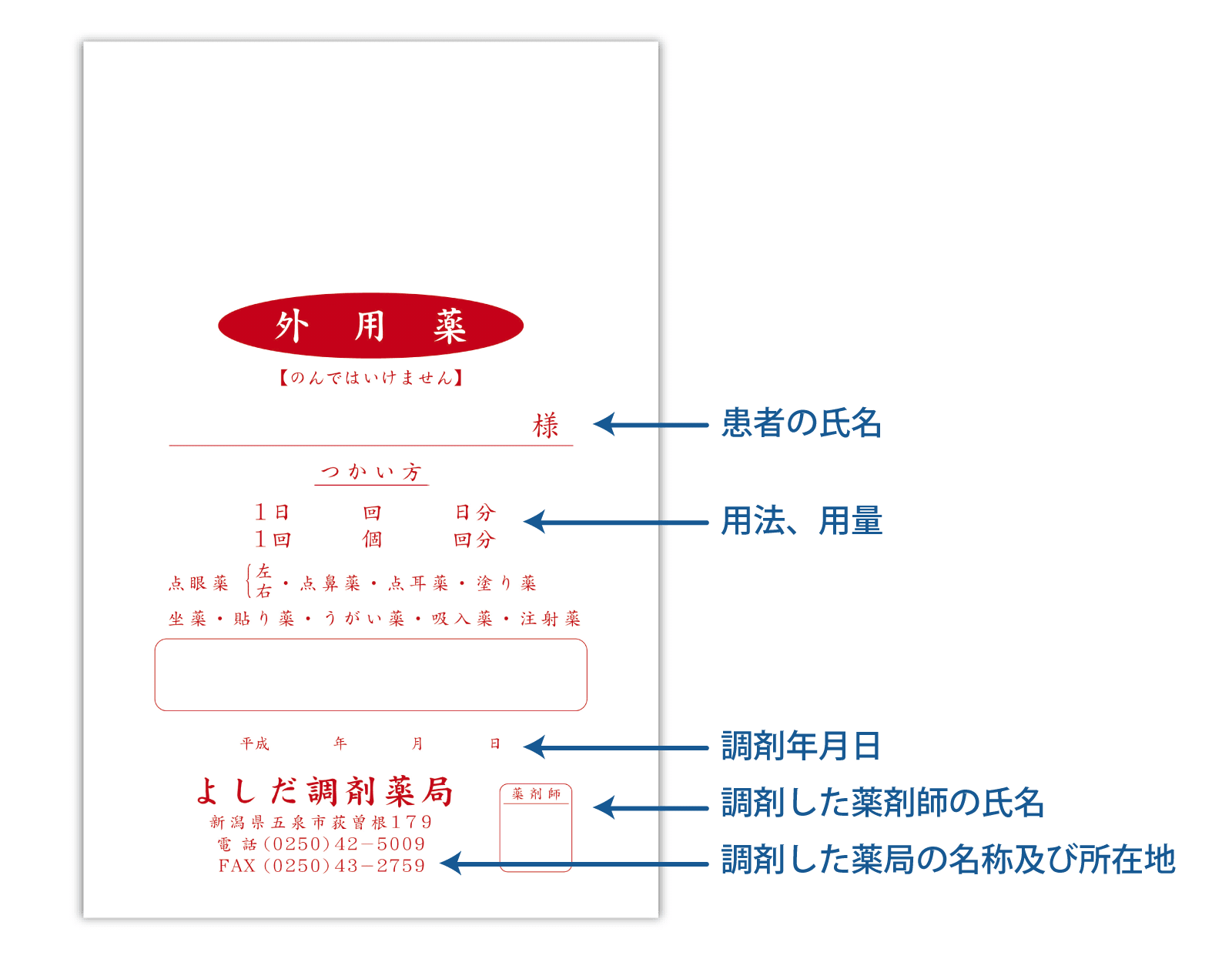 第二十五条 薬剤師は、販売又は授与の目的で調剤した薬剤の容器又は被包に、処方せんに記載された患者の氏名、用法、用量その他厚生労働省令で定める事項を記載しなければならない。